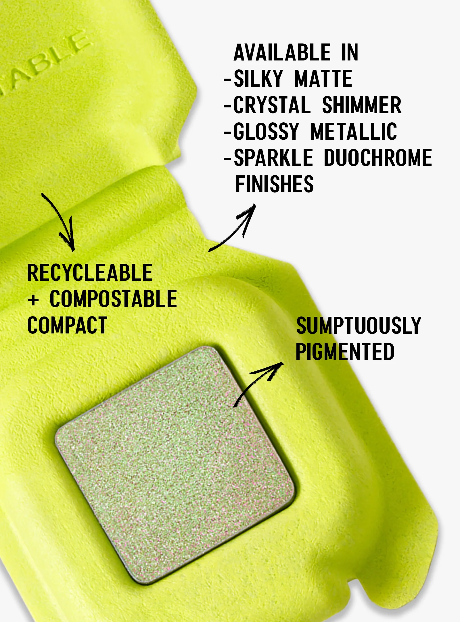 Sumptuously pigmented eyeshadows, each tucked away in a pocket-sized, first-of-its-kind, compostable compact. Mix and match colors and finishes to create a beauty color scape that is uniquely you.