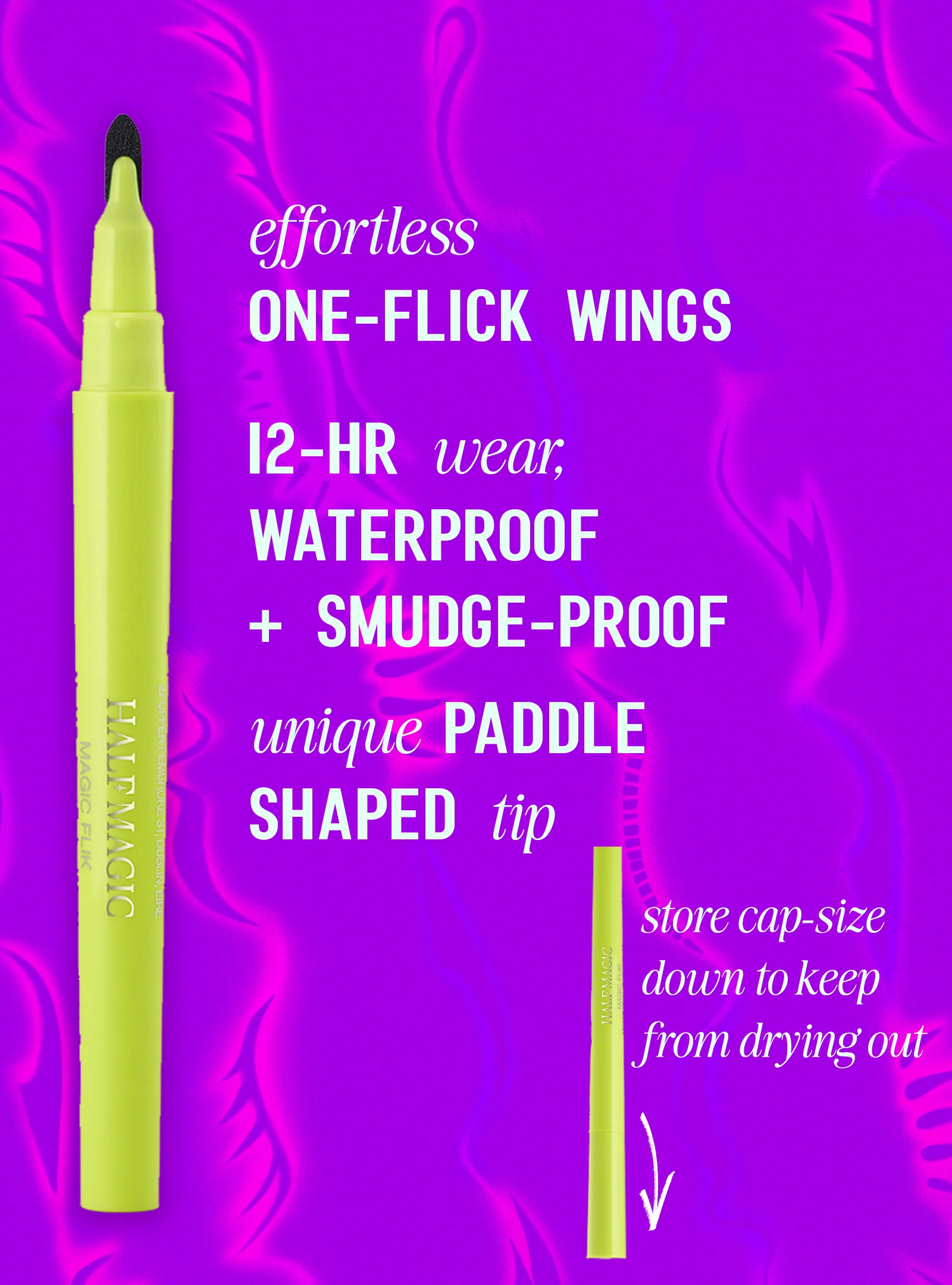 An ultra-bold calligraphy eyeliner pen, with a uniquely shaped paddle tip that hugs your lash line for effortless one-flick wings.