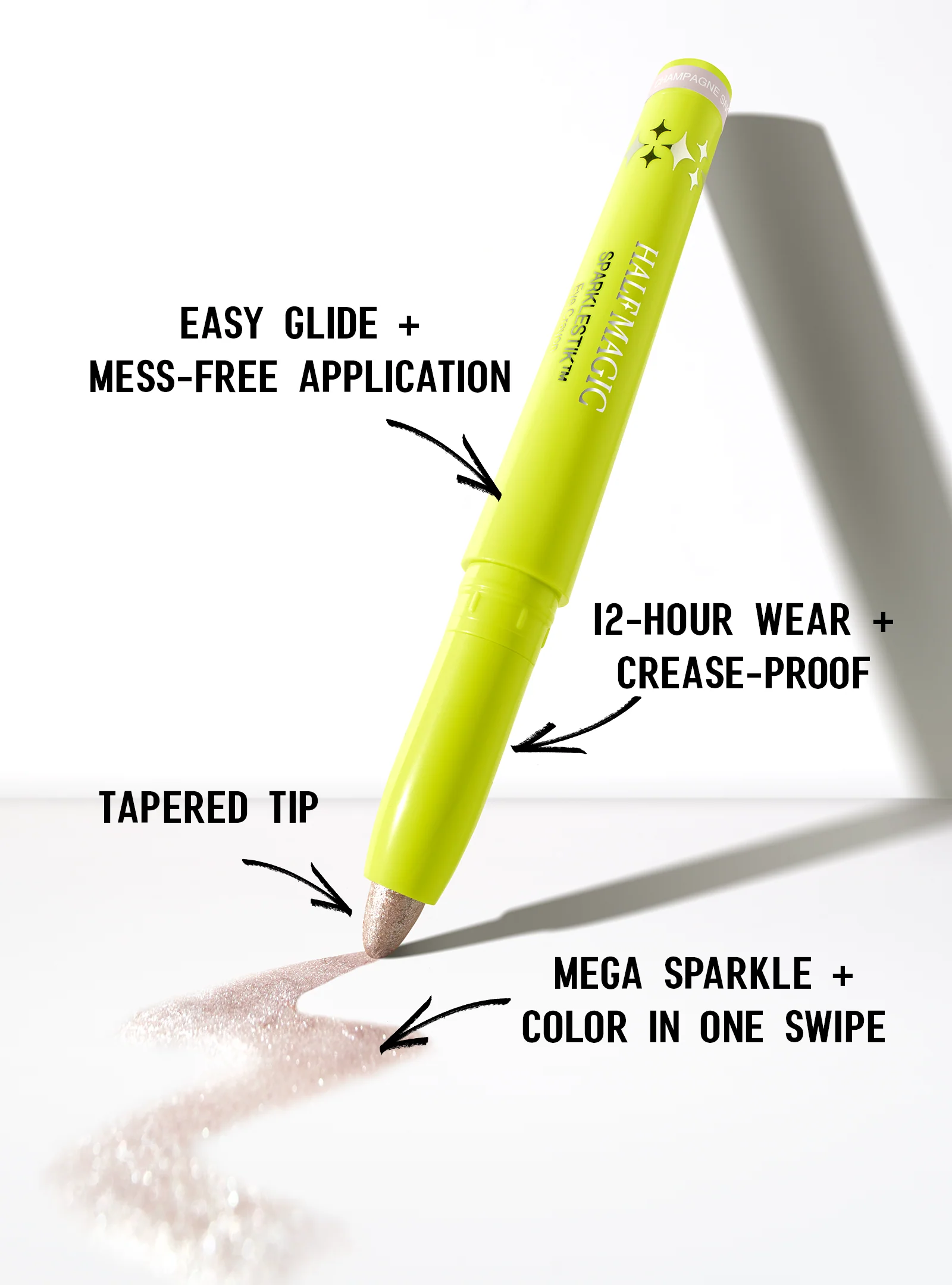 12 hours of crease-proof, mega sparkle + color in one swipe.